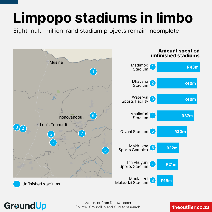 In the past year, GroundUp and the Limpopo Mirror have reported on a string of sports complexes and stadiums, each built for tens of millions of rands, but never completed or used. Several have been left to fall into ruin.