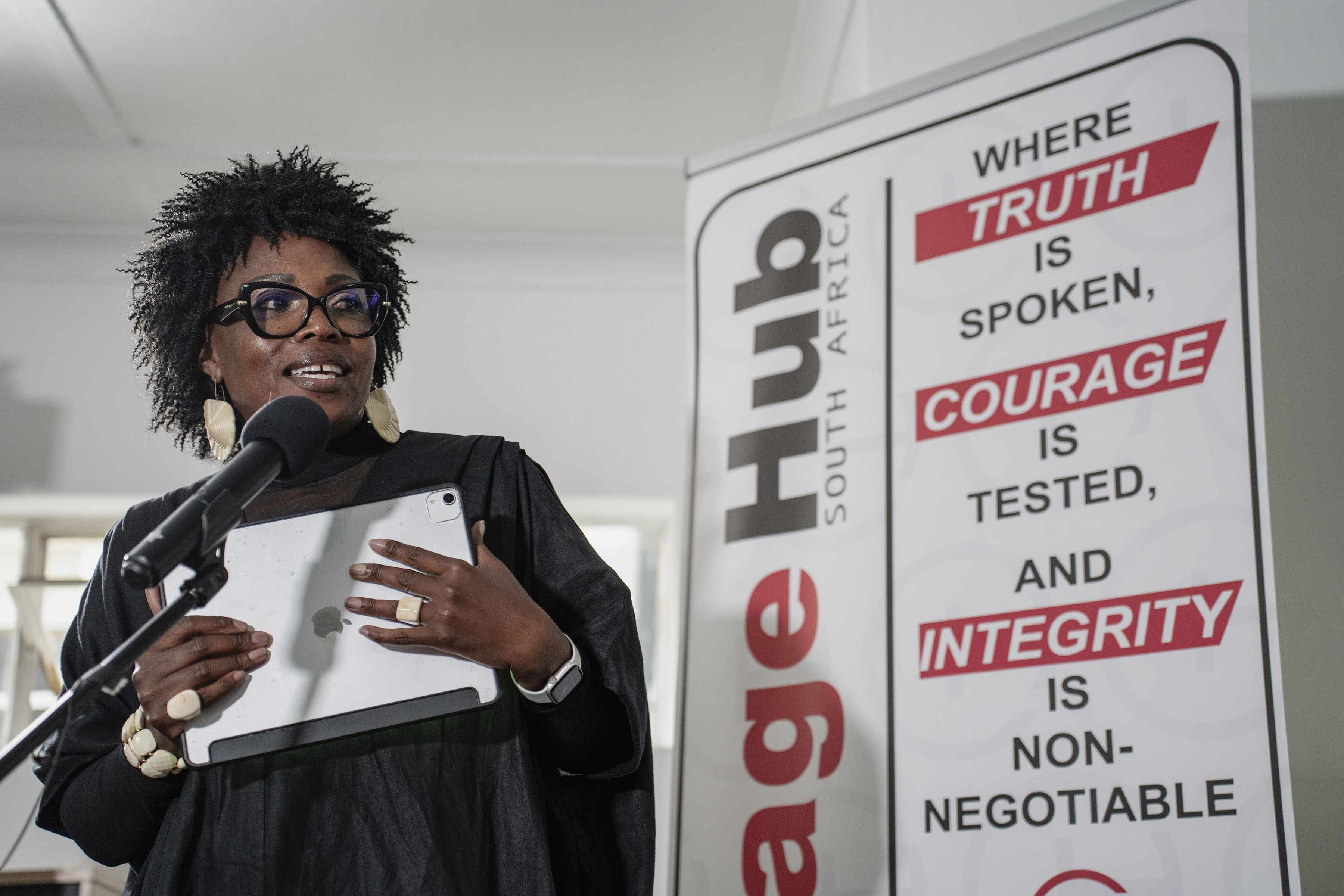 Attorney and PRASA whistleblower Martha Ngoye addresses the audience at the launch of the Courage Hub SA. Photo: Ihsaan Haffejee