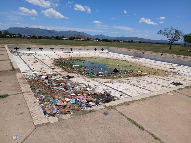 The pool forms part of sports grounds, which were once a hub for events. The soccer and cricket facilities are no longer used, and the pool is empty. Windows are broken, toilets vandalised, and basins and seats at the toilets are damaged. This is despite the entire facility having been renovated in 2009.