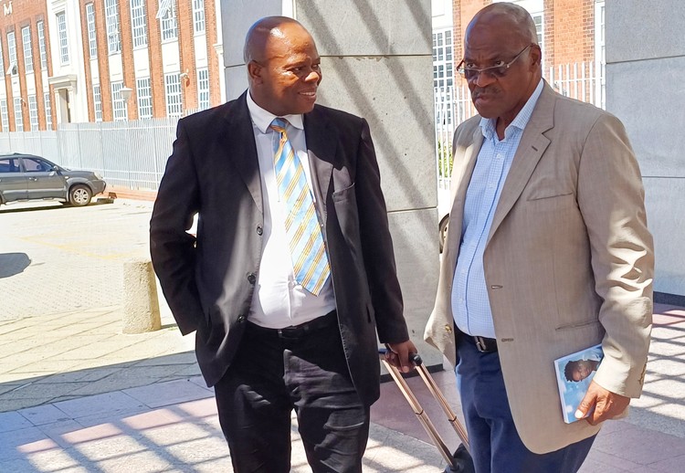Former PRASA Western Cape manager Mthuthuzeli Swartz (on right) with advocate Mzwamadoda Mnyani outside the Gqeberha Commercial Crimes Court. Archive photo: Steve Kretzmann