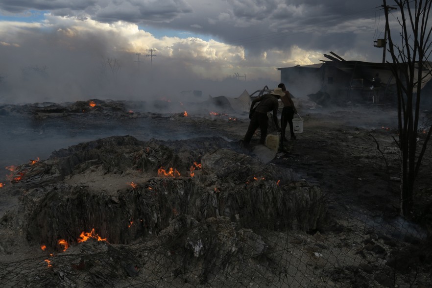 With only a small, tractor-driven water pump supplied by the municipality for firefighting, teenagers and boys try douse flames emitting toxic smoke at a recycling centre that caught fire in Douglas, Northern Cape, on 5 November.