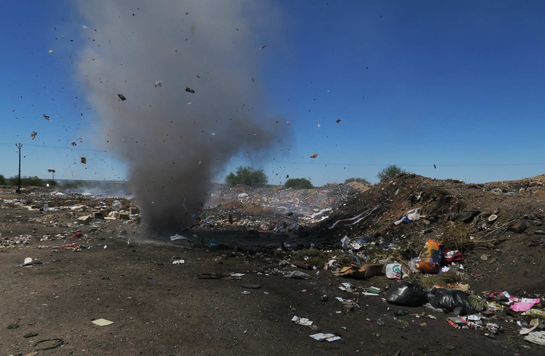 A dust devil, formed in 37-degree heat, twists through the mounds of burnt debris at the unregulated Douglas landfill. Photos: Steve Kretzmann