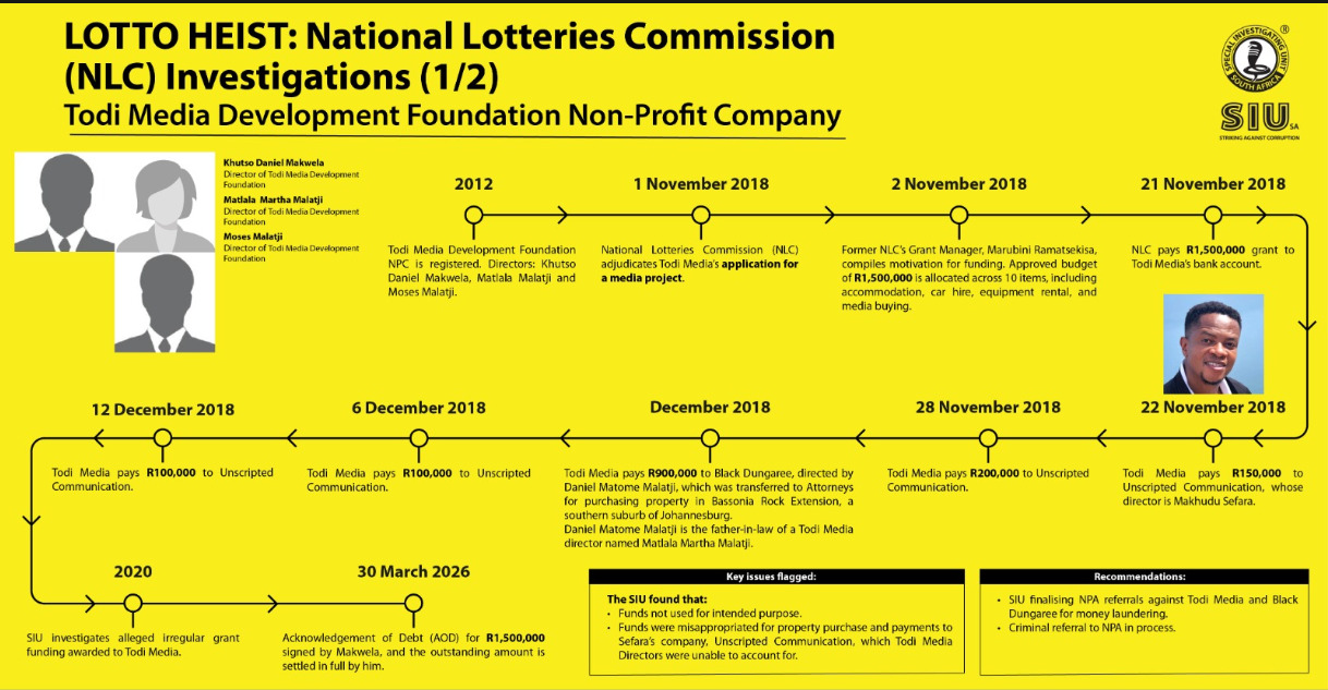 His company, Unscripted Communication, received four payments from Todi Media Foundation totalling R550,000 between 21 November and 12 December 2018 for a lottery-funded “media” project, according to the SIU.