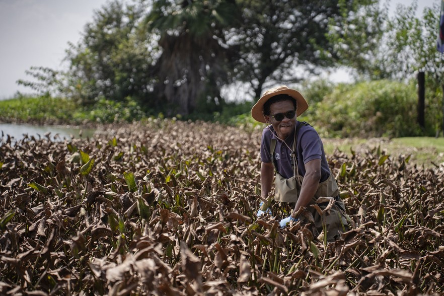Dr Kelby English wades through dying water hyacinth at the Hartbeespoort Dam, collecting samples for research.