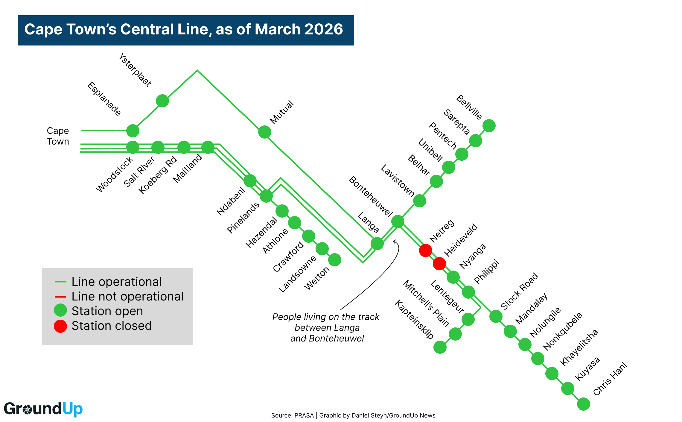 Map of the Cape Town Central Line showing operational stations and lines,as of March 2026.