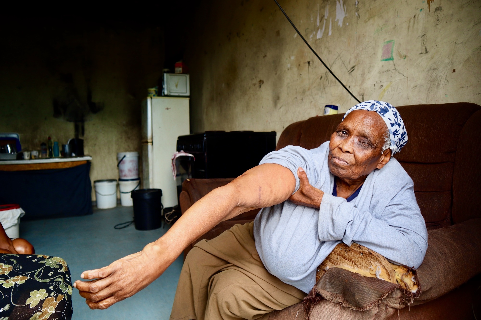 Philisiwe Ngcobo, 80, stays in one of the offices with five grandchildren. She sleeps on the only bed in the room. The others sleep on mattresses on the floor.