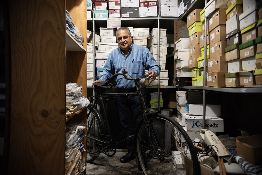 Kooverjee, in a back store-room at Babu’s Footwear, shows the original delivery bicycle used by his grandfather to drop off shoes in the 1920s. Naresh has kept many of his grandfather’s belongings, including a leather tool bag he made for his tools, old account books and a small copper Hindu temple used by the family for prayers and offerings.