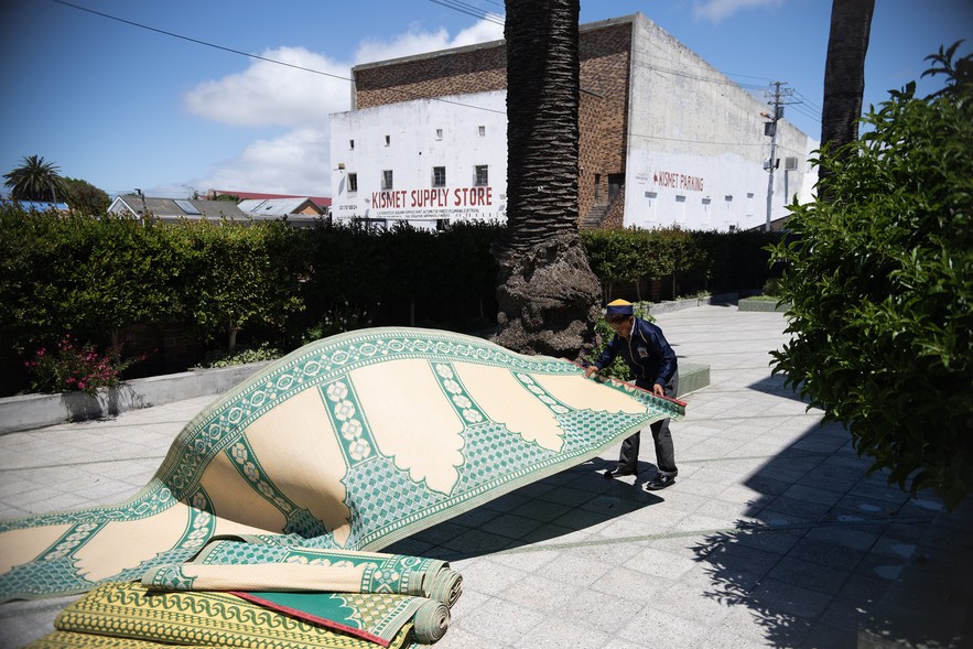 A young boy sets out prayer mats outside the Park Road mosque in Wittebome ahead of Friday prayers. The building behind him used to be the Luxurama Theatre.