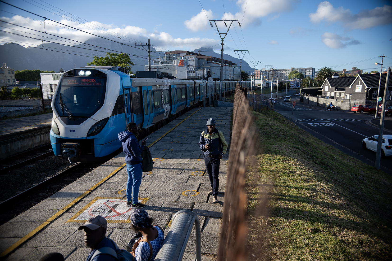 Workers at the end of a long day wait for the southbound train at the Wittebome station platform. The railway line separates Wittebome from Wynberg Main Road and the areas classified as white and non-white during apartheid.