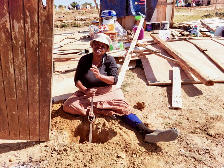 Tholakhele Nkosi digging a hole with just the head of a pickaxe to put up a support pole for her shack. Photos: Kimberly Mutandiro Johannesburg metro police demolished shacks in Rabie Ridge for the ...