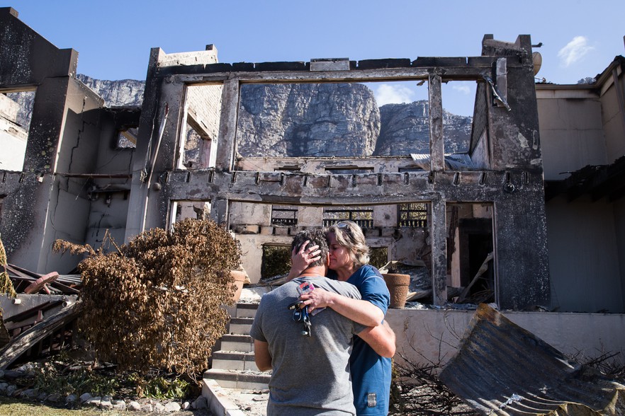 12 January: Juanita Booyse and her husband Manie break down in tears outside their destroyed home in Betty’s Bay. Dozens of homes were destroyed in a fire in the Overstrand.