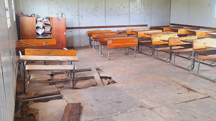 Prefab classrooms used for older learners are in poor condition and have large holes in the floor. Doors do not close properly, and windows are covered with plastic. Brick-and-mortar classrooms built with donations from the community are also in disrepair.