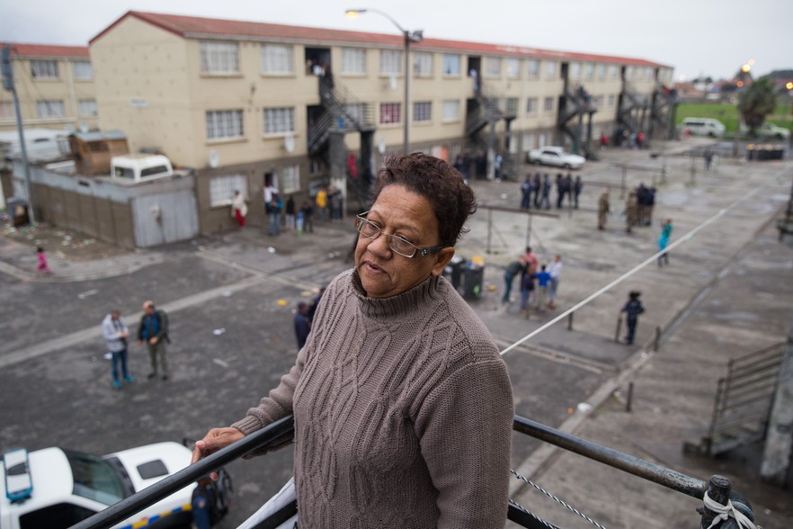 “Where do these guys get the guns from?” asked resident Julia Koen. Koen has been staying for 31 years in Hanover Park and says that she has seen many children shot dead in the courtyard pictured above. Koen says that she’s happy with the army deployment. “It’s something we’ve been asking for a long time”.