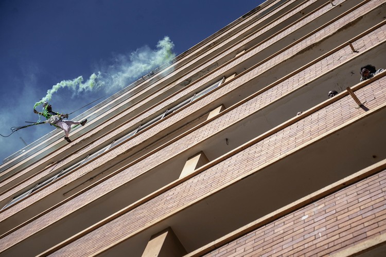 A performer hangs off the top of a building in an acrobatic performance.