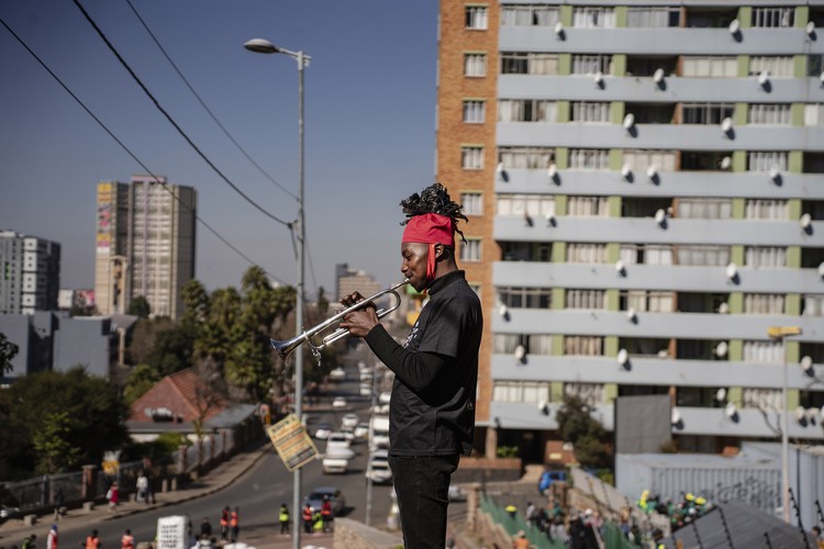 A musician from the Ezase Vaal Brass Band blows his trumpet against the backdrop of Hillbrow to mark the start of the parade.