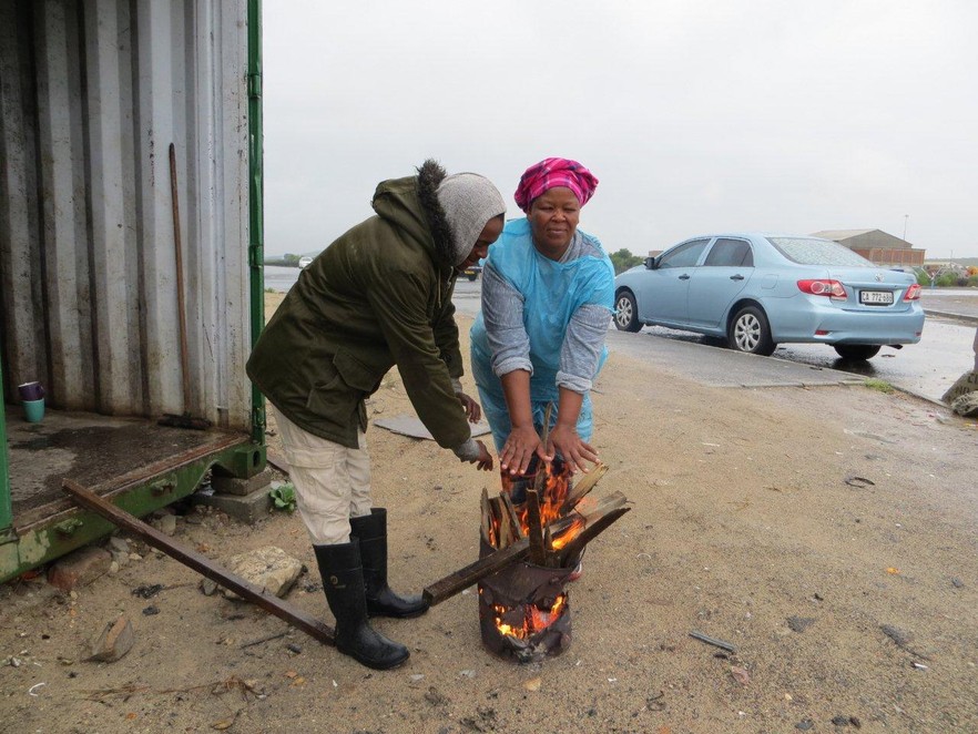 Lindamandla Mabutyana and Thozama Dyum, who assisted the above trio to unblock the storm water drain, lit a small fire to keep warm while standing in the rain. Photo: Vincent Lali
