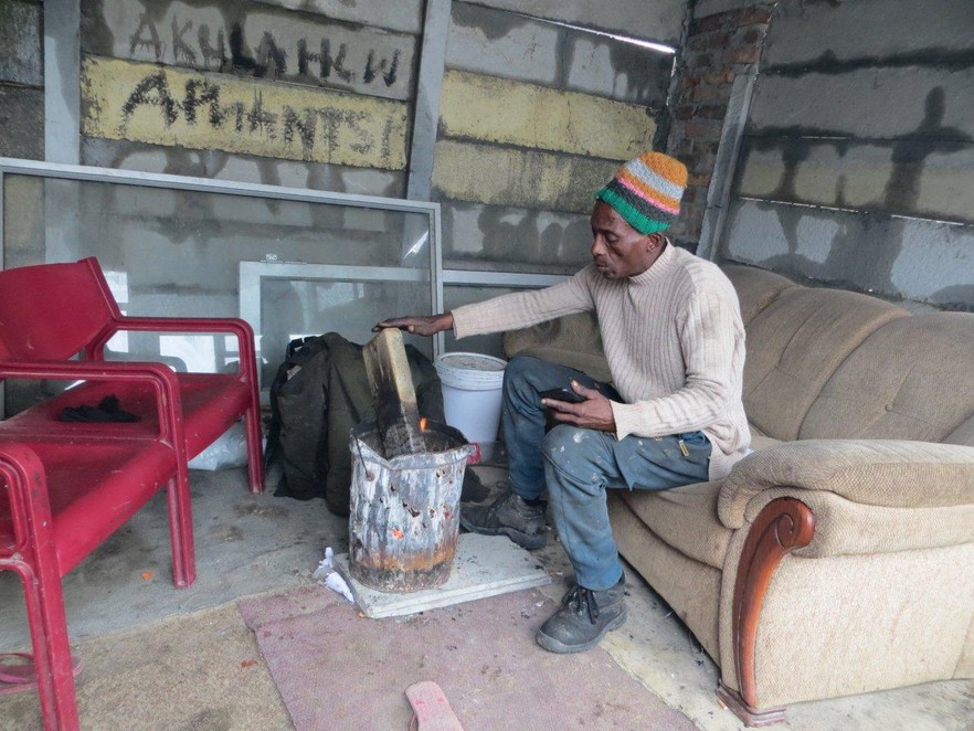 Wearing damp clothes, community leader Vumile Madikane sits next to his brazier to keep warm inside his home at Ethembeni informal settlement. Photo: Vincent Lali