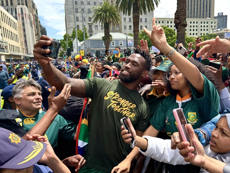 Springbok rugby captain Siya Kolisi takes a selfie with a fan outside the City Hall on Friday. The Springboks are touring the country to celebrate their World Cup win. Photos: Matthew Hirsch