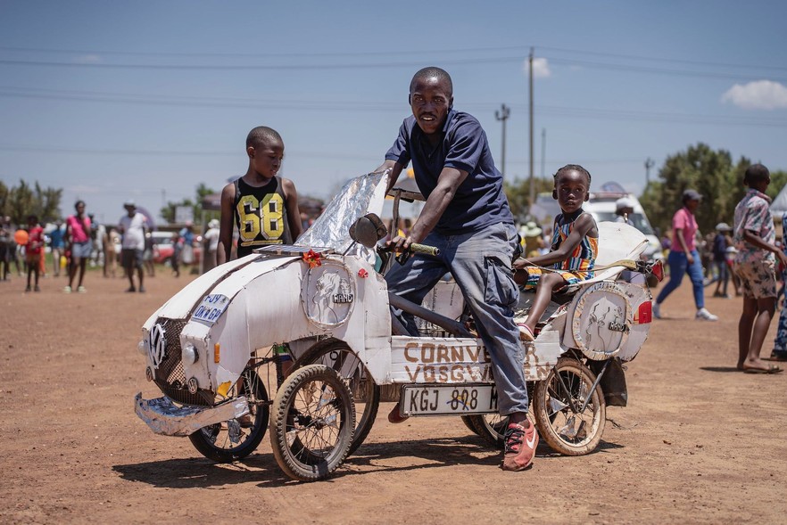 Sifiso Zwane, a local resident, showing off his homemade toy car built around a bicycle frame.
