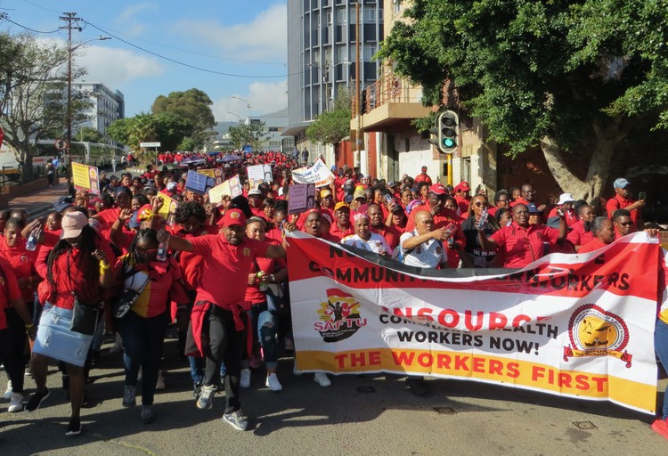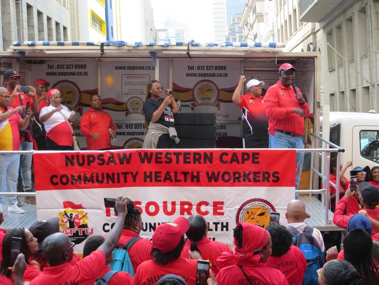 Hundreds of community health workers toyi-toyed and sang struggle songs outside the offices of Western Cape Premier Alan Winde in Cape Town on Friday in a protest organised by the National Union of Public Service and Allied Workers (NUPSAW).