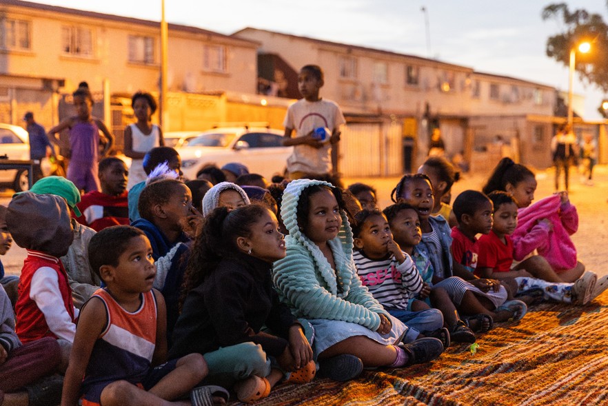 Every second Saturday, a small street in Manenberg, Cape Town, is turned into an open air cinema for young children.