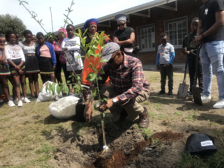 Vuyani Qamata of the Gugulethu Urban Food Forest Initiative plants a citrus tree with the learners from Nobantu Primary School. He said the orange trees would start producing fruit with the next three years.