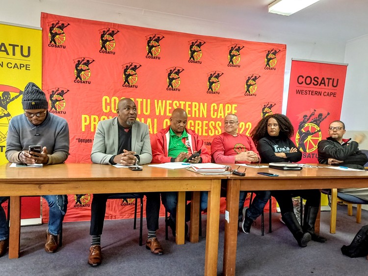 Union leaders announced a strike on 4 August. From left, Michael Helu (Agricultural Food and Allied Democratic Workers Union provincial secretary), Motlatsi Tsubane (COSATU provincial chair), Malvern De Bruyn (COSATU provincial secretary), Ernest Theron (South African Communist Party provincial treasurer), Vicky Sampson (Trade Union for Musicians of South Africa president), and Jaco Van Heerden (Democratic Nursing Organisation of South Africa). Photo: Marecia Damons