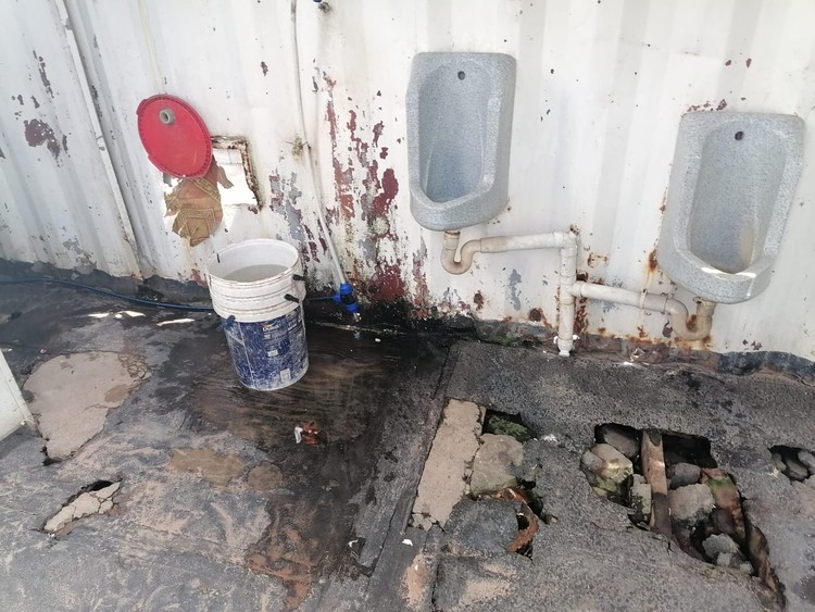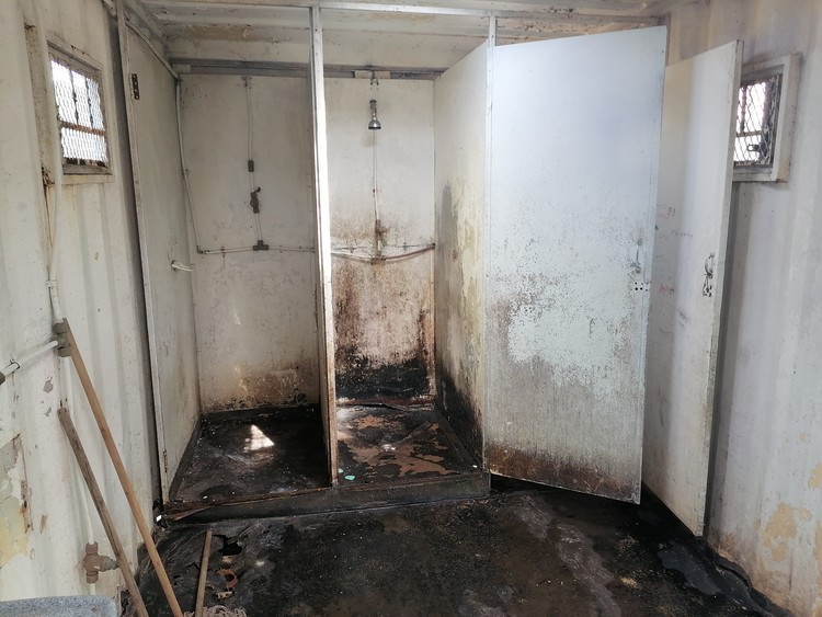 There are 609 households sharing two urinals, two flush toilets (the others are broken) and two showers set up in a shipping container. Most people wash themselves in their homes.