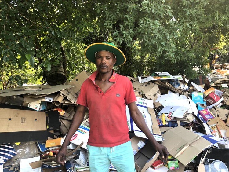Thato Simbe says the material he is storing to resell is worth R14,000. He is hoping to sell the recyclables in December so he can visit his wife and children in Lesotho.