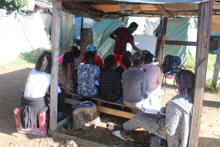 About ten children aged from ten to 15 have been getting maths lessons. Every day the chilldren have been sitting on crates and wooden benches in a shelter from 2:45pm until early evening, listening to 27-year-old Angelo Lidi, who is one of the refugees. Lidi says he decided to use the time to equip the children with maths skills. The children have not been in school since their families started the protest in 2019.