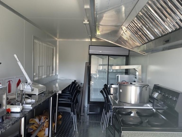 The kitchen is fitted with a stove, fridges, fryers, and a griller, and there are chairs and tables and umbrellas, so customers can sit and wait for their orders.