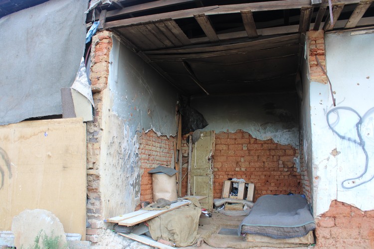 Around the building are makeshift shacks made of wooden boards and plastic sheeting with blankets. Some rooms are shared by two or three families, sometimes divided by curtains.