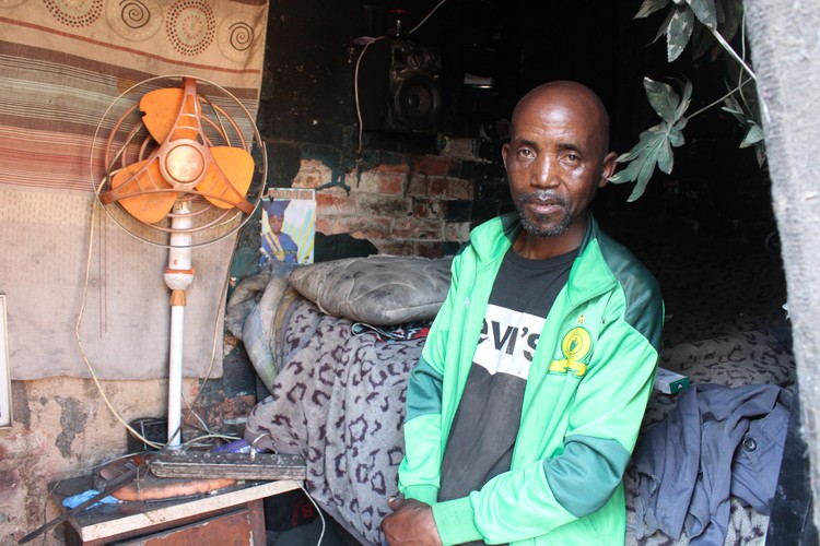 At the back of the main building, Thabo Meva has a small shack, just big enough for a bed and a few possessions. He and others moved to Gomora when they were evicted from a building in Jeppestown in 2008. He works as a casual cleaner at the nearby Central police station, earning R2,000 per month and cannot afford another place. His wife is in hospital suffering from tuberculosis.