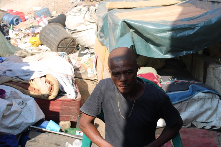 In the evening he lights a fire to cook for himself and a sickly elderly man who sleeps on a mattress, covered with plastic, next to his shack.