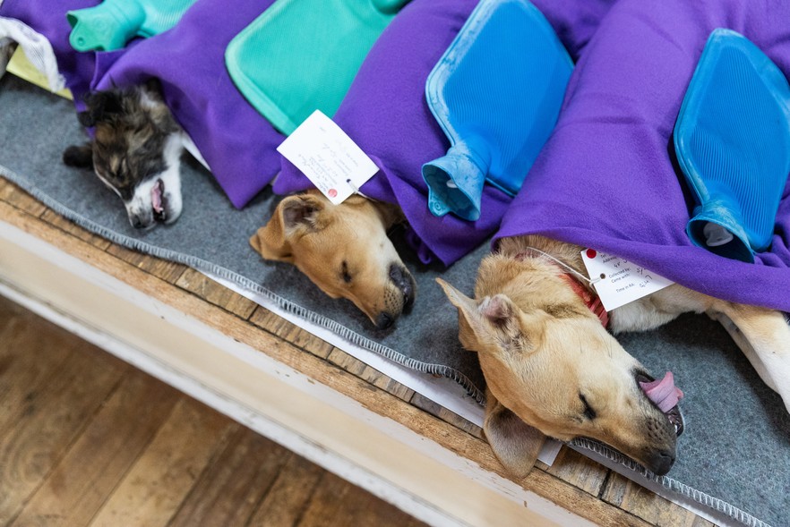 Dogs recovering from anaesthesia after being sterilised.