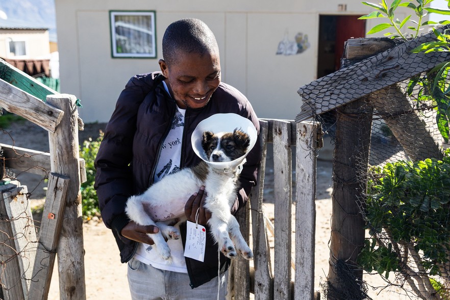 Phakisi Ngxongxela welcomes his dog back after being sterilised and checked. He said that seeing people help animals in the community encouraged him to look after his dog.