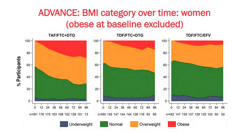 In the ADVANCE study, people taking TAF were more likely to become obese than people on the standard regimen. By the end of the study the gain in weight on the DTG and DTG+TAF group had not plateaued.