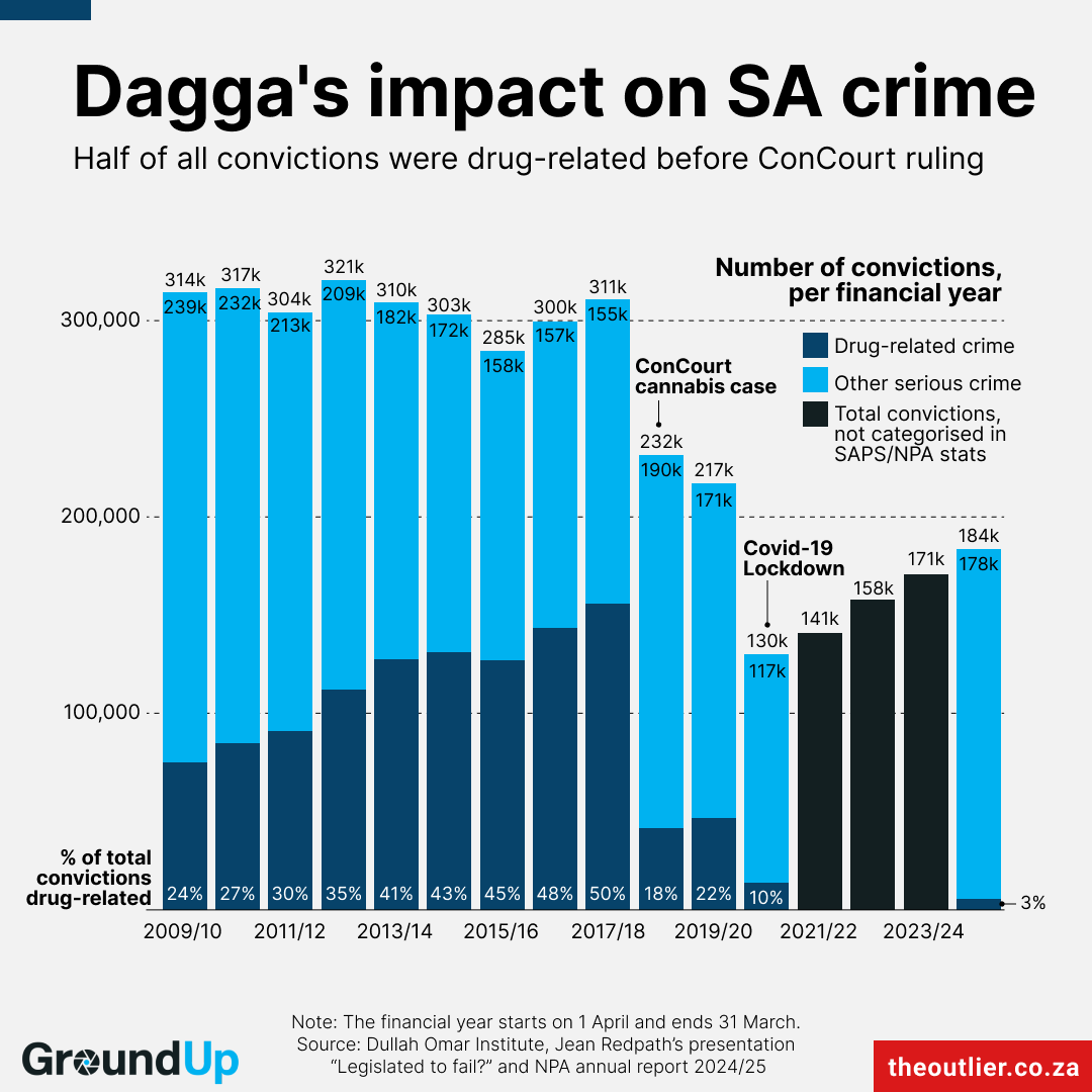 There is a gap in the data between 2021 and 2023 because the NPA’s annual reports for those years did not contain figures for total drug-related convictions. In the NPA’s 2024/25 annual report, only 5,575 drug-related convictions are reported.