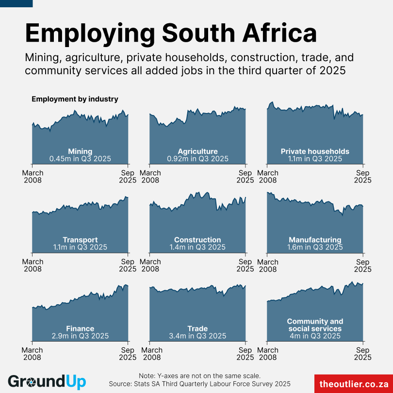 StatsSA’s quarterly labour force data goes back to 2008. At the start of that year, South Africa had an unemployment rate of 23.2%, with 14.4-million people employed. At the end of the third quarter of 2025, there were 17-million people with jobs in the country. But because of population growth, the unemployment rate is still higher than in 2008, at 31.9%. The working-age population was 31.5-million in 2008 and is now approximately 41.9-million.