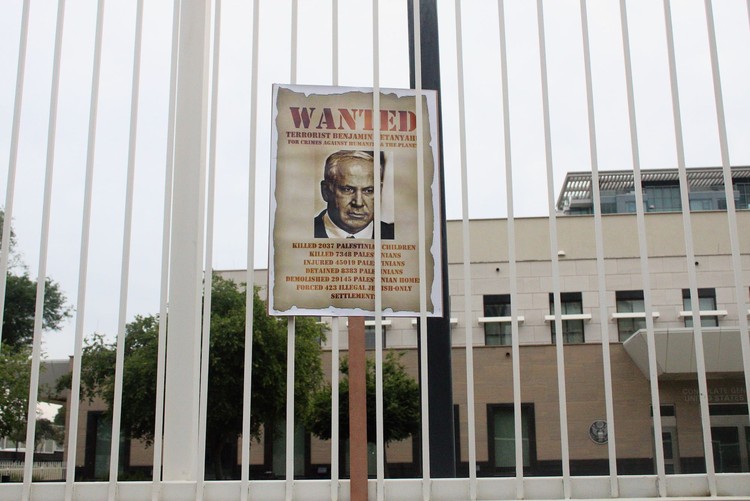 A “Wanted” poster for Israeli Prime Minister Benjamin Natanyahu was erected on the consulate’s fence. Flyers detailing the gruesome effects of the bombing of Gaza were distributed.