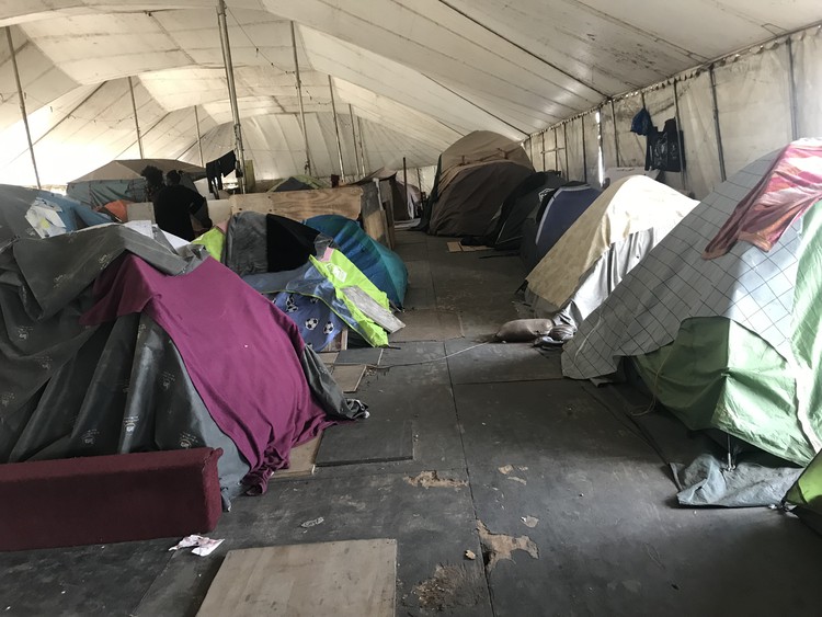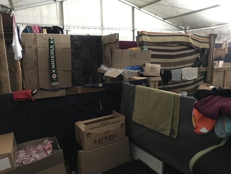 The men’s side at the Bellville camp. Residents have partitioned off their sleeping spots with cardboard boxes. Photo: Tariro Washinyira