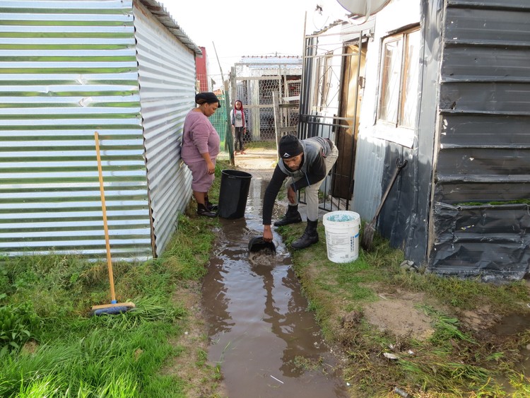 Phumla Ludid and Linduxolo Nguta remove water next to their shack in Sinazo informal settlement on Monday morning. Ludid said: “The water built up behind my shack during the heavy rain last night. It seeps into my shack and dams up under my bed and other furniture.” Photo: Vincent Lali