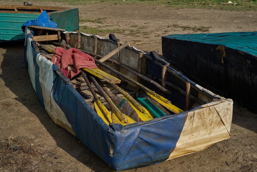A homemade boat sits on the shore in Nibela. Some boats are made of material, but the local chief insisted that the fishers make their boats with wood as it is safer.