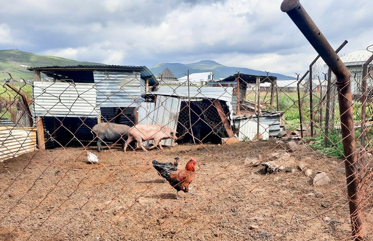 Livestock, including sheep, pigs and chickens, are also kept at the facility, fenced in using the identical material around the sports centre. Corrugated iron roofing sheets that had been blown off are being used to make kraals.