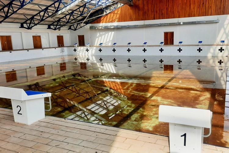The abandoned swimming-pool with stagnant rain water.
