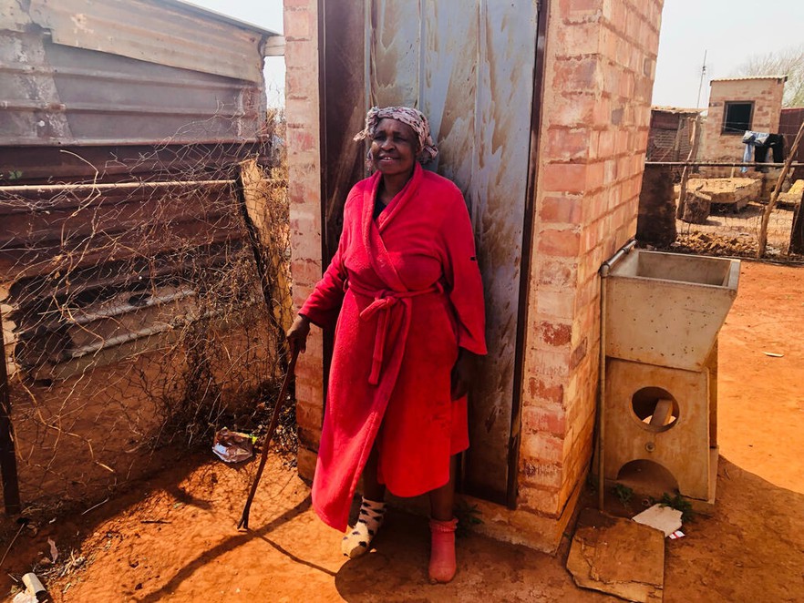 Dina Gafe, who was moved to a serviced stand in Extension 9, suffered a stroke a few years ago and has lost the use of her hands, and uses a stick to walk. Her stand has a toilet, but she is unable to use it as it has been locked since the day she was moved there in 2014. The communal street chemical toilet is too far for her and she struggles every time she wants to use the toilet.