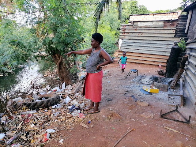 Catherine Sebola points to a dam of sewage next to her house. Photos: Bernard Chiguvare