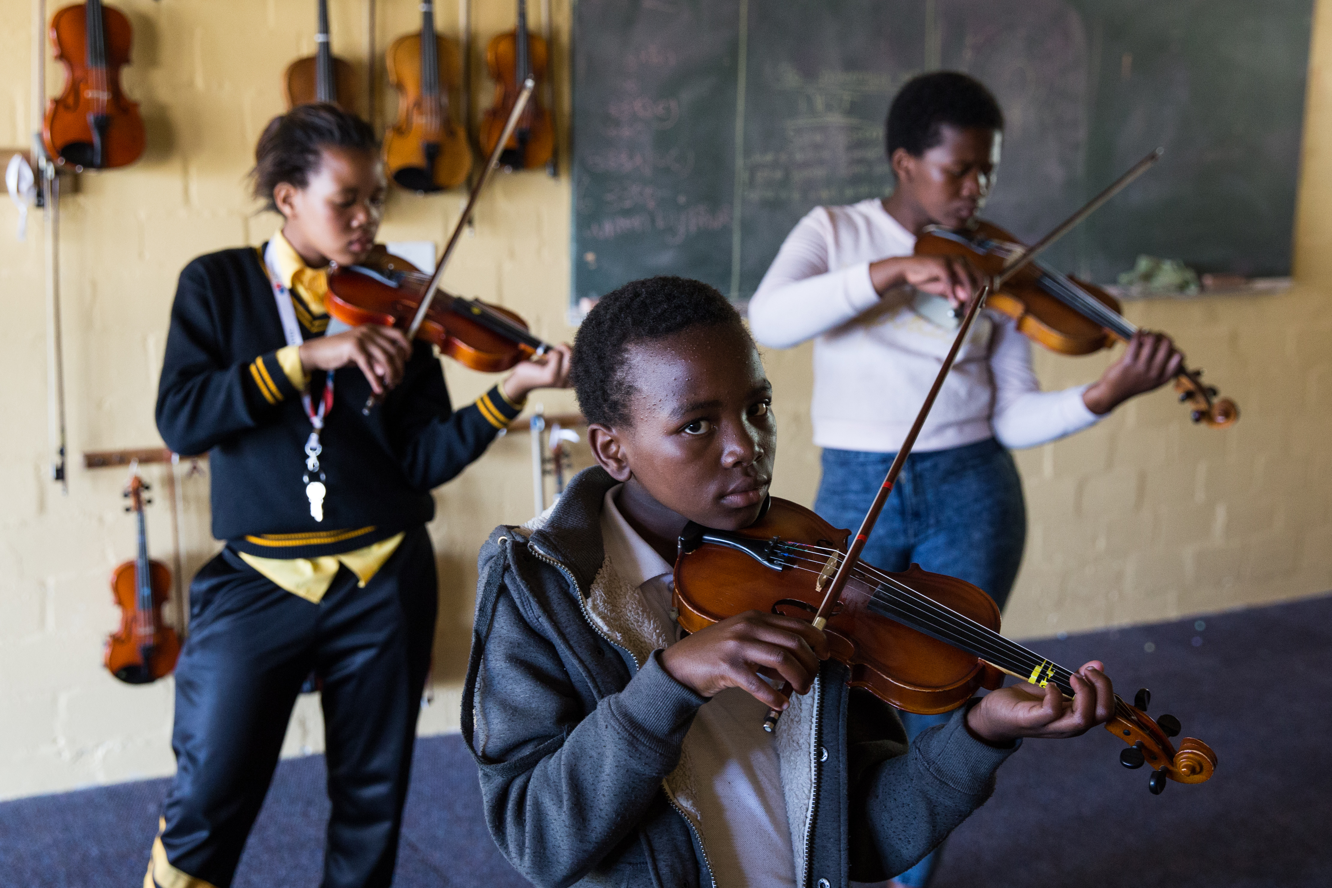 The students arrive in casual clothes, school uniforms and even soccer apparel. Before they start, they listen closely to Blake, tuning their violins. None of them read sheet music, so they practice by listening and remembering. The violins have been donated by Bishops Diocesan College and individuals. Although Blake mostly teaches on Mondays and Thursday, the kids come out on their own to practice almost daily.