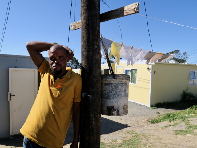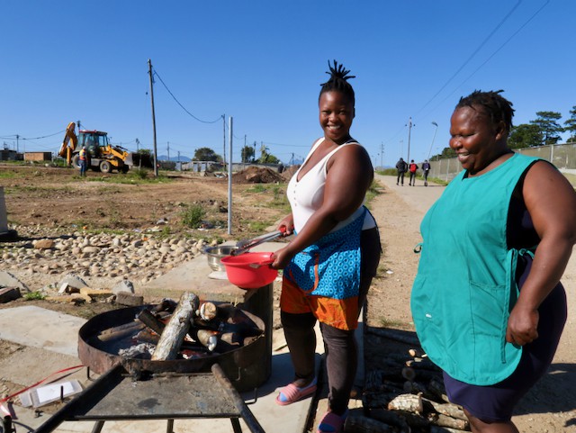Bukeka Mhlambiso (right) and her eldest daughter, Busisiwe, prepare a fire on which to cook chicken feet and offal for workers returning to the Qolweni informal settlement, where she has been living in a large shack for the past 18 months. By selling street food, cold drinks and loose cigarettes, Mhlambiso manages to care for her four children and six nieces and nephews who were orphaned when their parents – Mhlambiso’s sister and brother-in-law – died in a car accident seven years ago. Behind her, contractors are starting the first phase of the Qolweni housing project, delays of which have resulted in protests shutting down the N2. She is looking forward to increased business when the construction workers arrive on site. “Everything is perfect. God is with me,” she said.