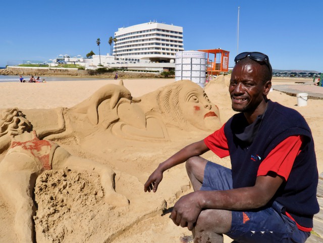 Lawrence Njajula supports his wife and child by busking as a sand artist on Plettenberg Bay’s main beach beside the Beacon Isle Hotel. Njajula, who came to Plettenberg Bay from King William’s Town ten years ago, lives in Qolweni informal settlement and hopes to live in a formal house as soon as he is on the housing list for state-subsidised homes.